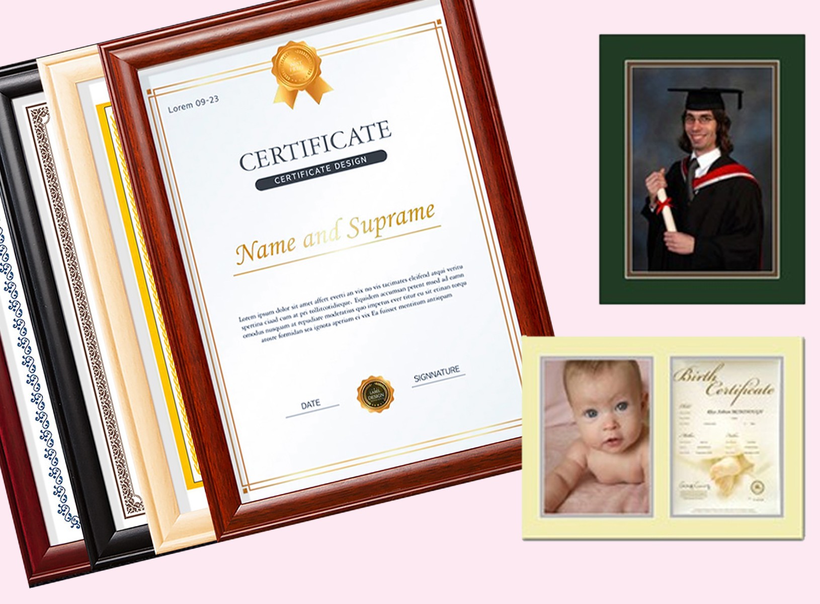 printing and framing, acrylic photo mounts, clip frames, frameless clip frames, and certificate frames.