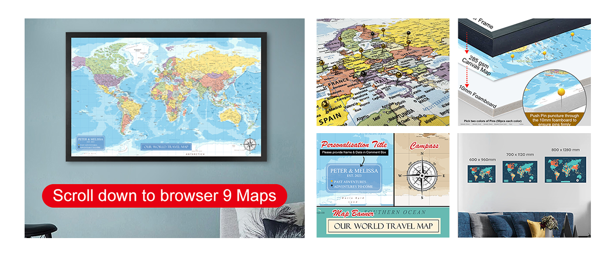 The map is printed on a 285 gsm matt canvas sprayed with UV protection laminate to ensure not fade and non-scratch, then mounted on 10mm thick foamboard with 10 different gallery frames to suit your interior set up.